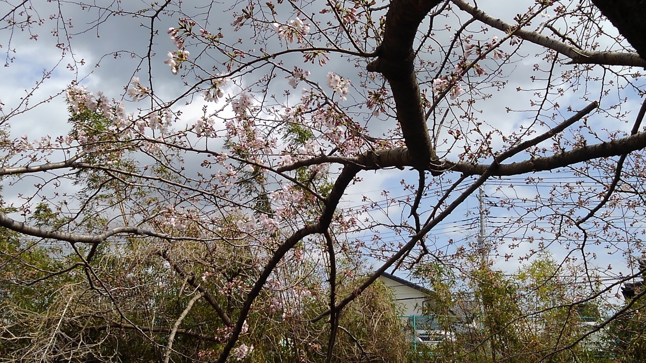 今日の桜堤の桜の開花状況です。あちこちの枝から桜が開花しています。